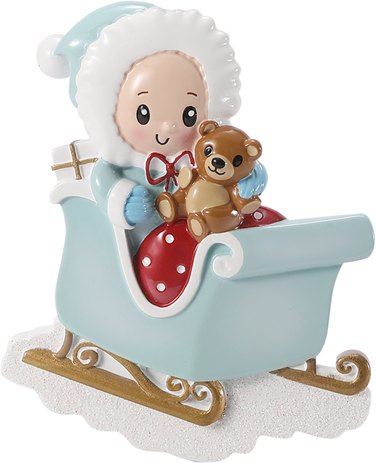 Baby with Stuffed Bear in Sleigh Personalized Ornament: Blue