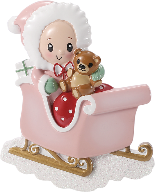 Baby with Stuffed Bear in Sleigh Personalized Ornament: Pink