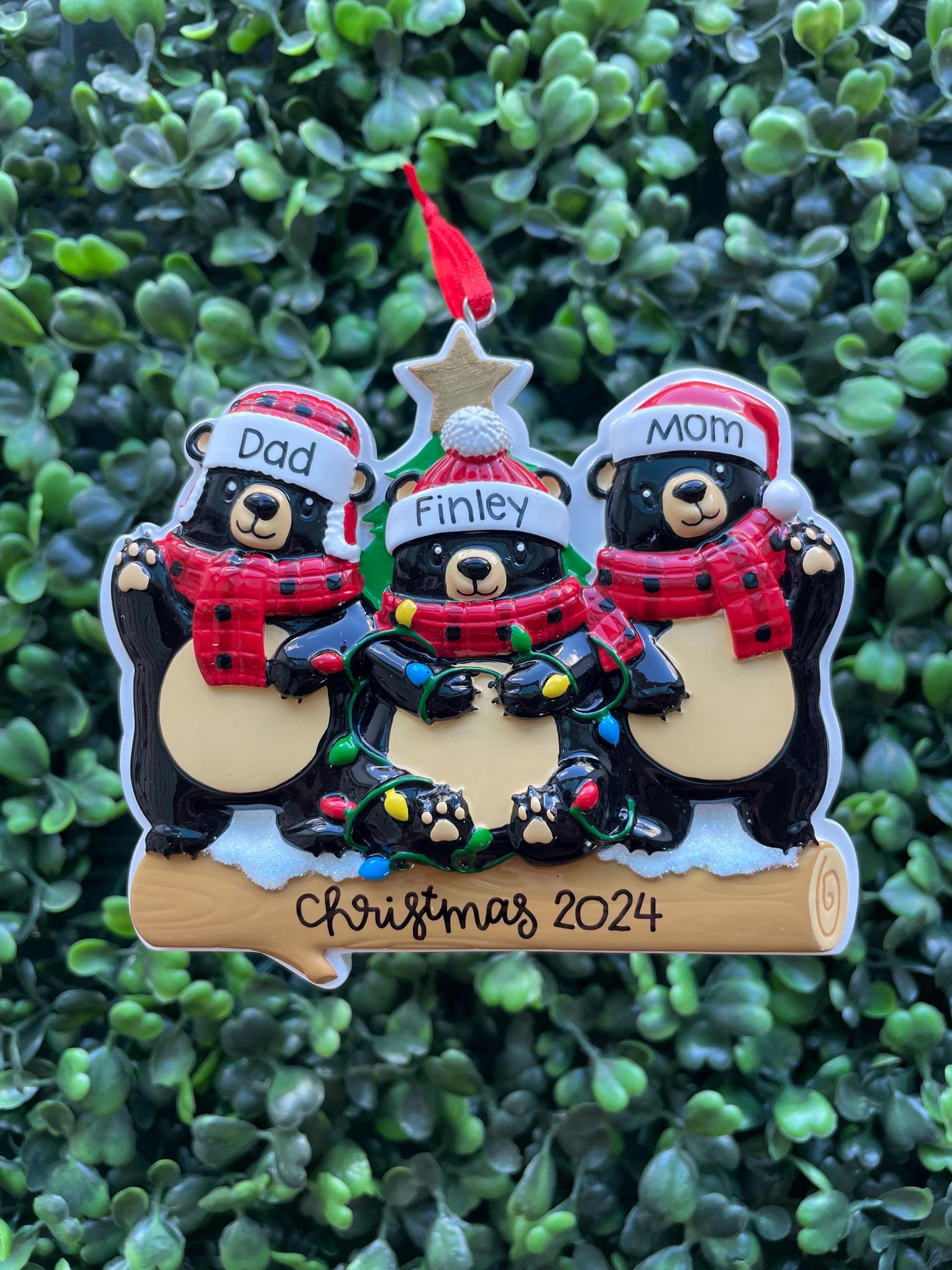 A family of three black bears are dressed in their cozy mountain attire and ready to be personalized and hung on your Christmas tree. Perfect for those living in the mountain or to remember a trip from this year.