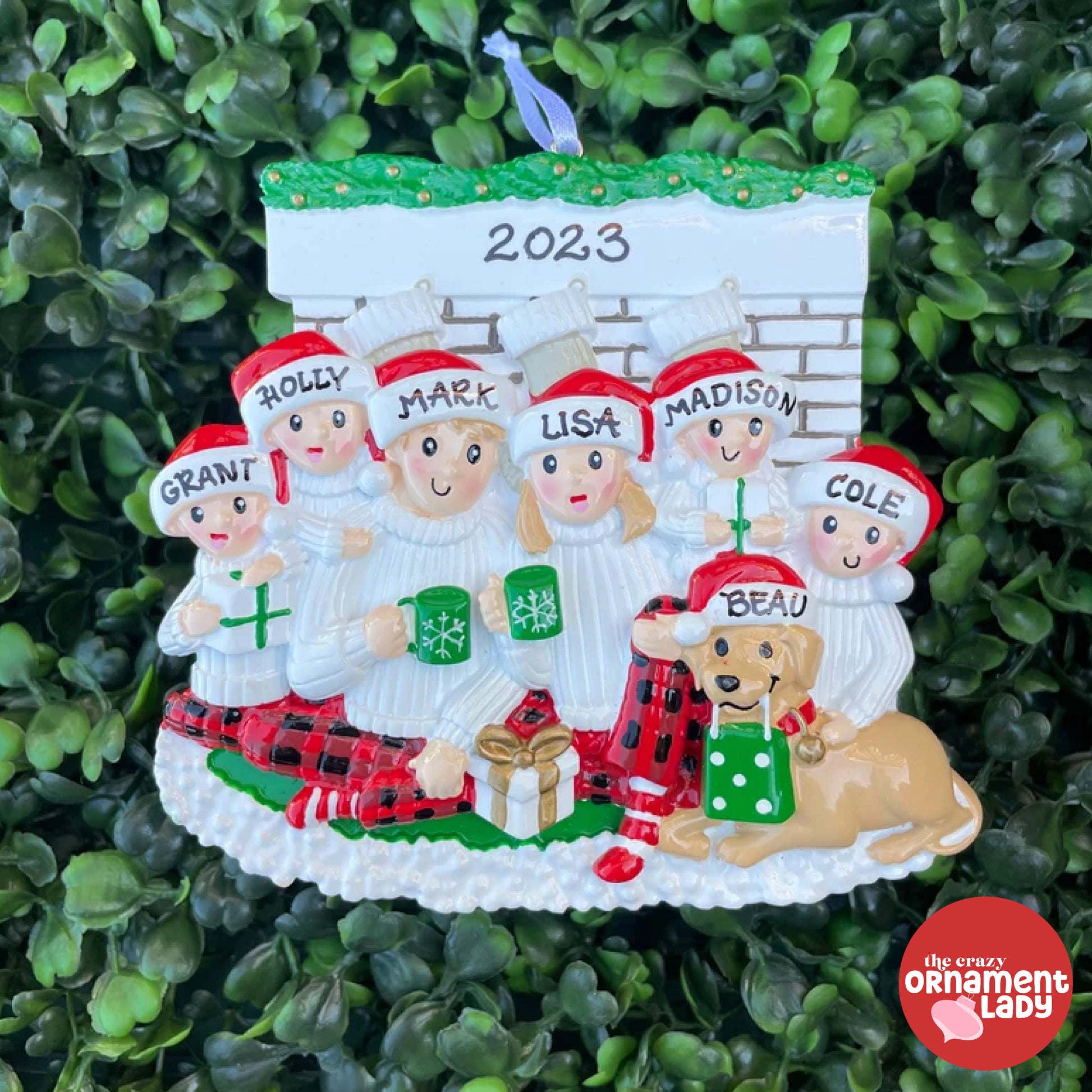 Snuggle up around the fire and unwrap the joy of Christmas morning. This family of six ornament features your favorite furry friend!