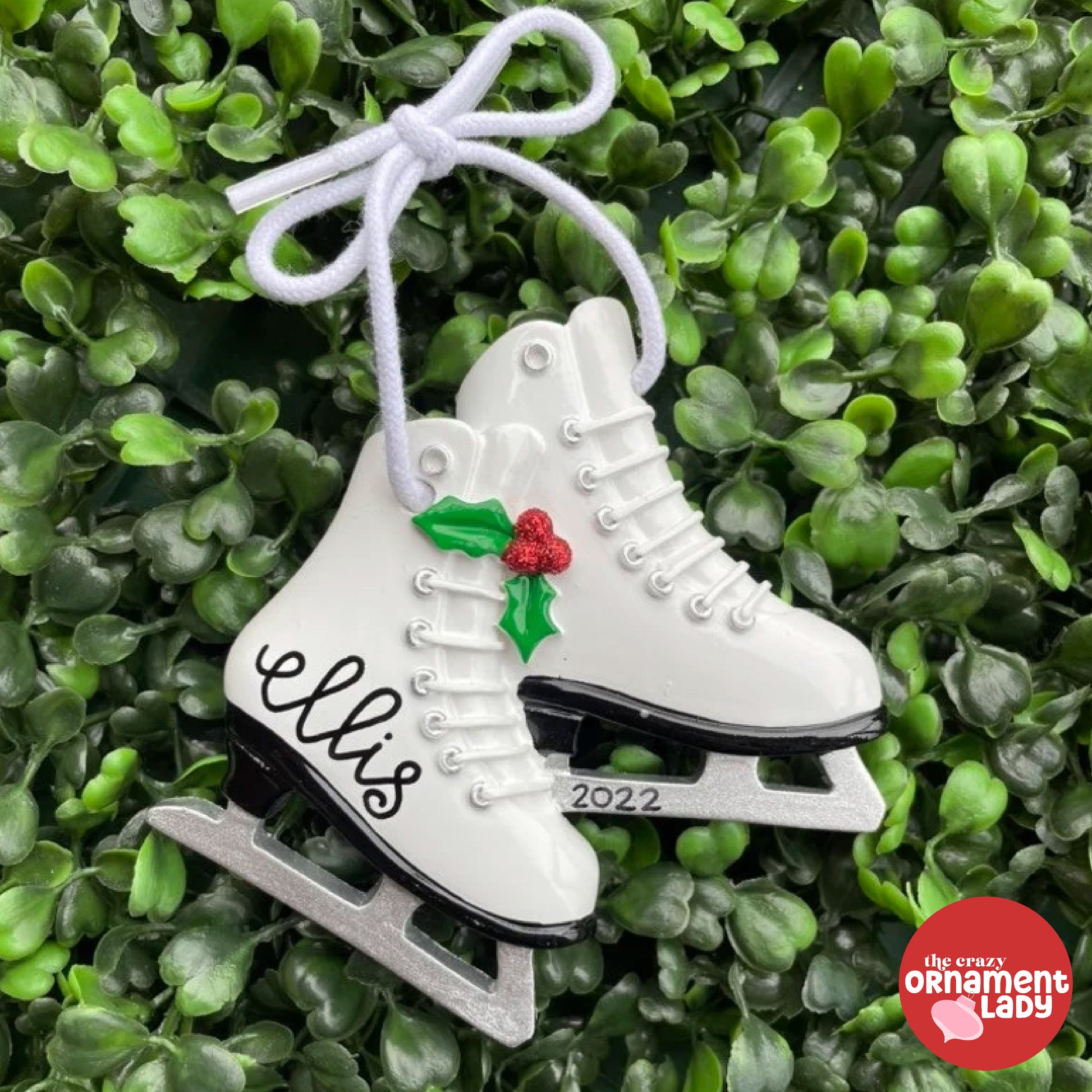 This pair of holiday adorned skates are the perfect Christmas ornament for the ice skater in your family, they feature a unique hanging lace and can be personalized with a name for an extra special gift.