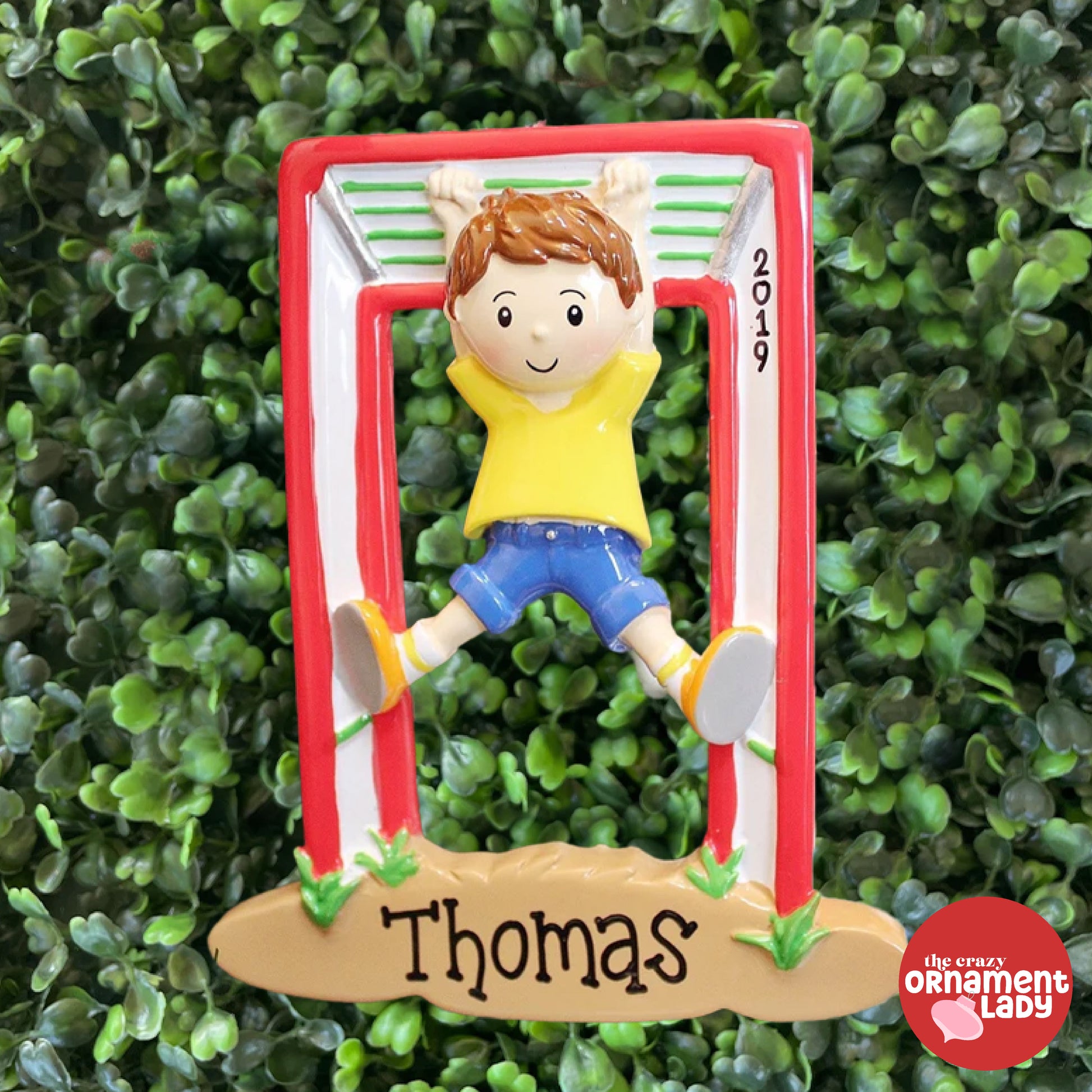 This personalized Christmas ornament features a little boy who has conquered the monkey bars. Perfect for the wild child in your life.