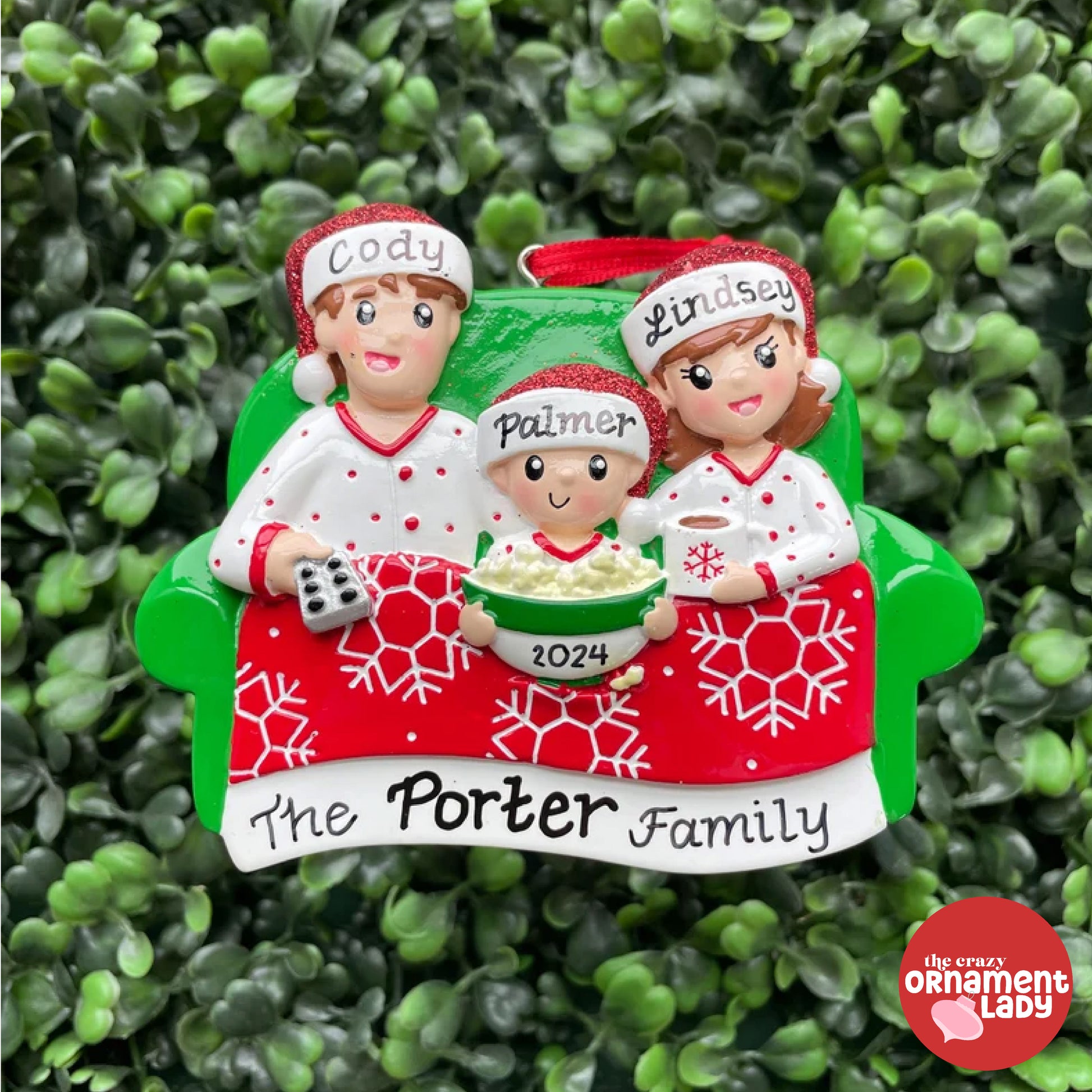 This family of three is cozied up on the couch for movie night. Every member of your family can have their name on the tree, making it the perfect addition to your holiday decor. Let the Christmas movie marathon begin!