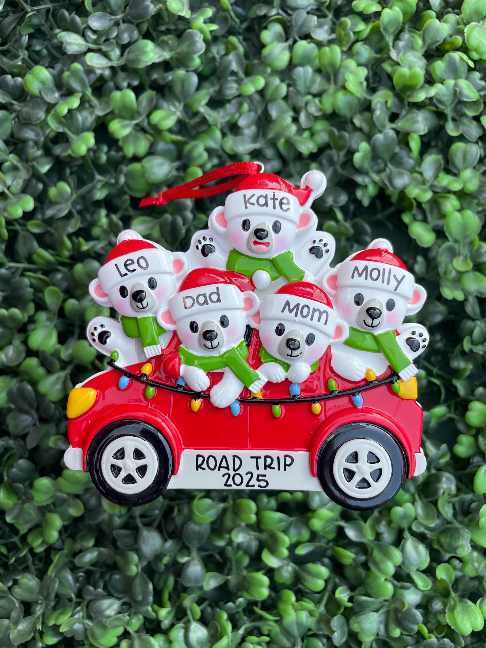 Bring a touch of wilderness whimsy to your space with the "Polar Bears in Car: Family of Five" ornament. This playful scene captures a cheerful family of polar bears packed snugly in a car, evoking fun road trip vibes and family togetherness. Perfect for adding personality to your holiday decor or gifting to animal lovers, this ornament sparks joy and smiles with every glance. Its charming design makes it a delightful reminder to cherish family adventures, big or small.