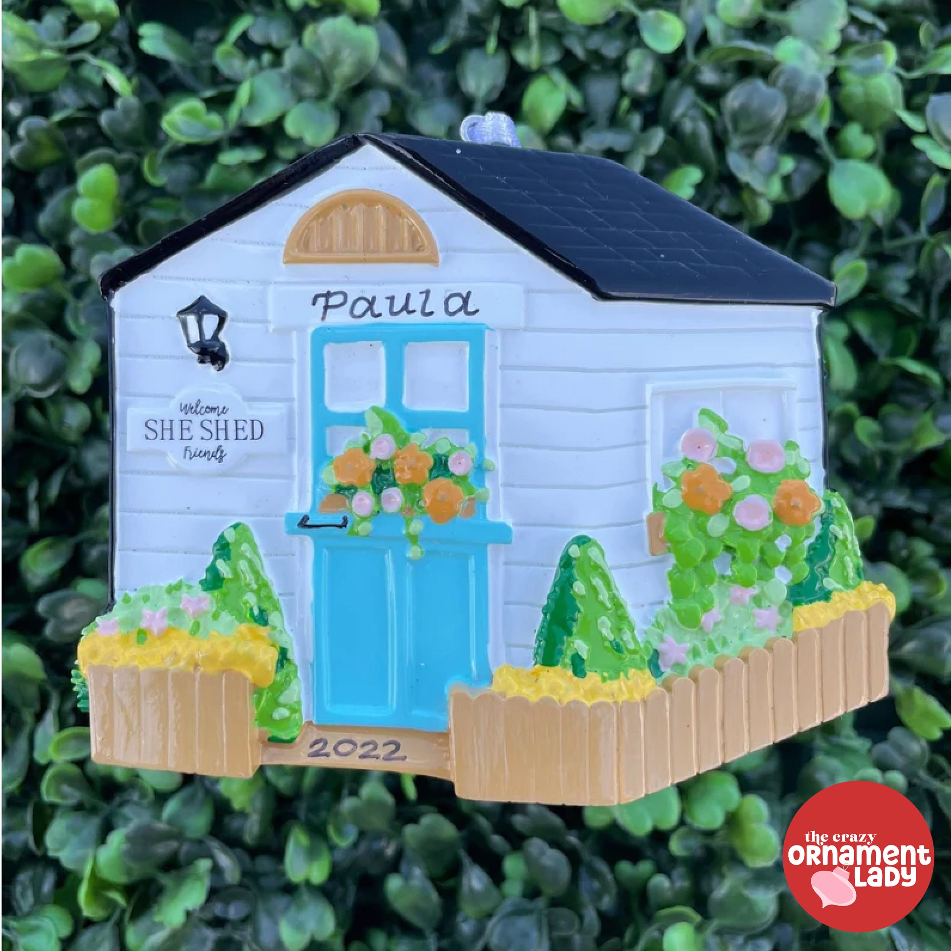 Transform your tree with this must-have She Shed Ornament! Featuring a charming garden style she shed design with a personalized name, this Christmas ornament is perfect for any floral-loving individual.