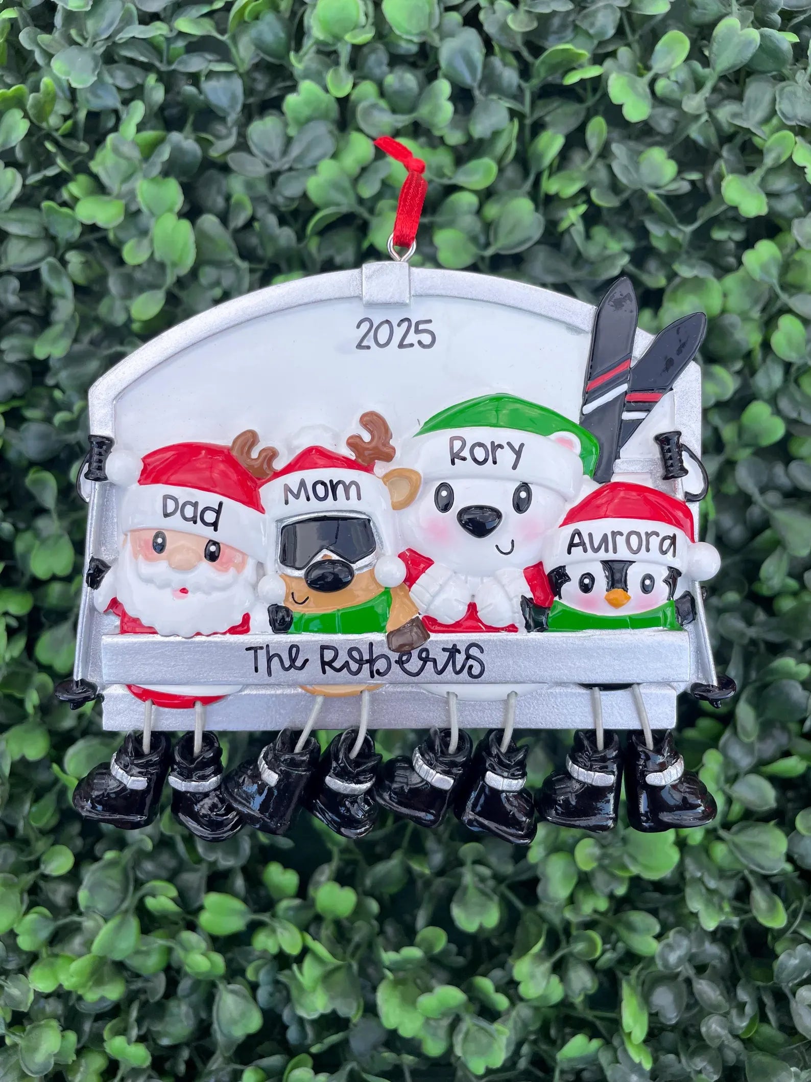 This festive ornament features a family of four ice skaters in a winter wonderland. Customize it with individual names and your family's last name to add holiday spirit to your tree!